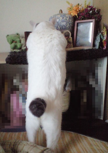 最近は故もんきち(享年18歳)の骨壷に供えている小皿に入ったカリカリを食べるのがブームらしく、←みたいに伸びて食べてます。